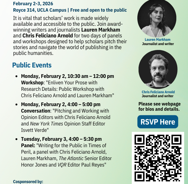 Monday, February 2, 4:00–5:00 PM (Royce 314) Conversation: “Pitching and Working with Opinion Editors with Chris Feliciano Arnold and New York Times Opinion Staff Editor Isvett Verde.”