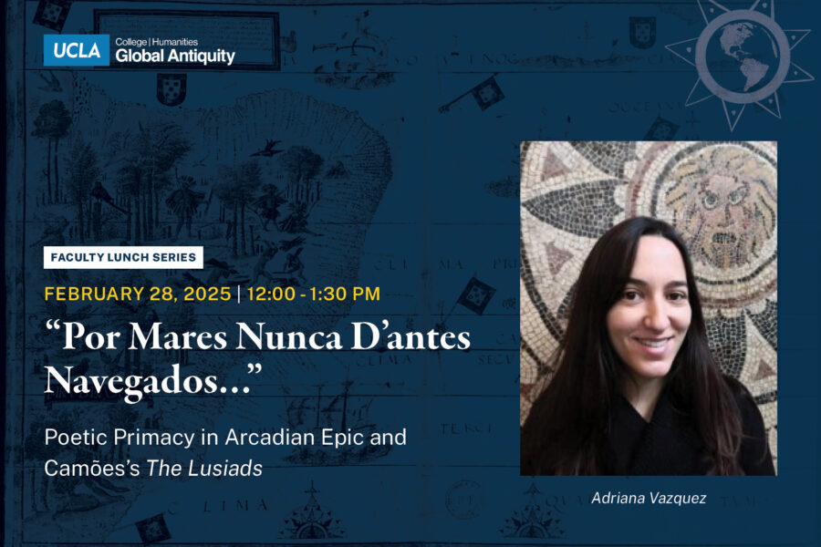 Global Antiquity is pleased to invite you to the next in its 2024–2025 Faculty Lunch Series talks, featuring Professor Adriana Vazquez (Classics, UCLA). On Friday, February 28 from 12:00–1:30 pm in Royce 306, she will deliver a lecture titled “Por Mores Nunca D’antes Navegados…”: Poetic Primacy in Arcadian Epic and Caminões’s The Lusiads. Lunch and refreshments will be served at 12:00 pm followed immediately by the talk and discussion. All are welcome, and we hope to see you there!