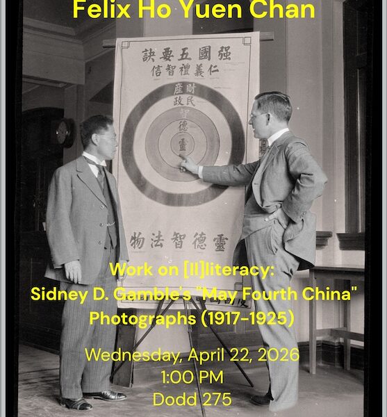 Please join us for a Department of Art History Colloquium with featured speaker Felix Ho Yuen Chan on Wednesday, Apr. 22 at 1 PM in Dodd 275 for his talk, Work on [Il]literacy: Sidney D. Gamble’s “May Fourth China” Photographs (1917-1925).