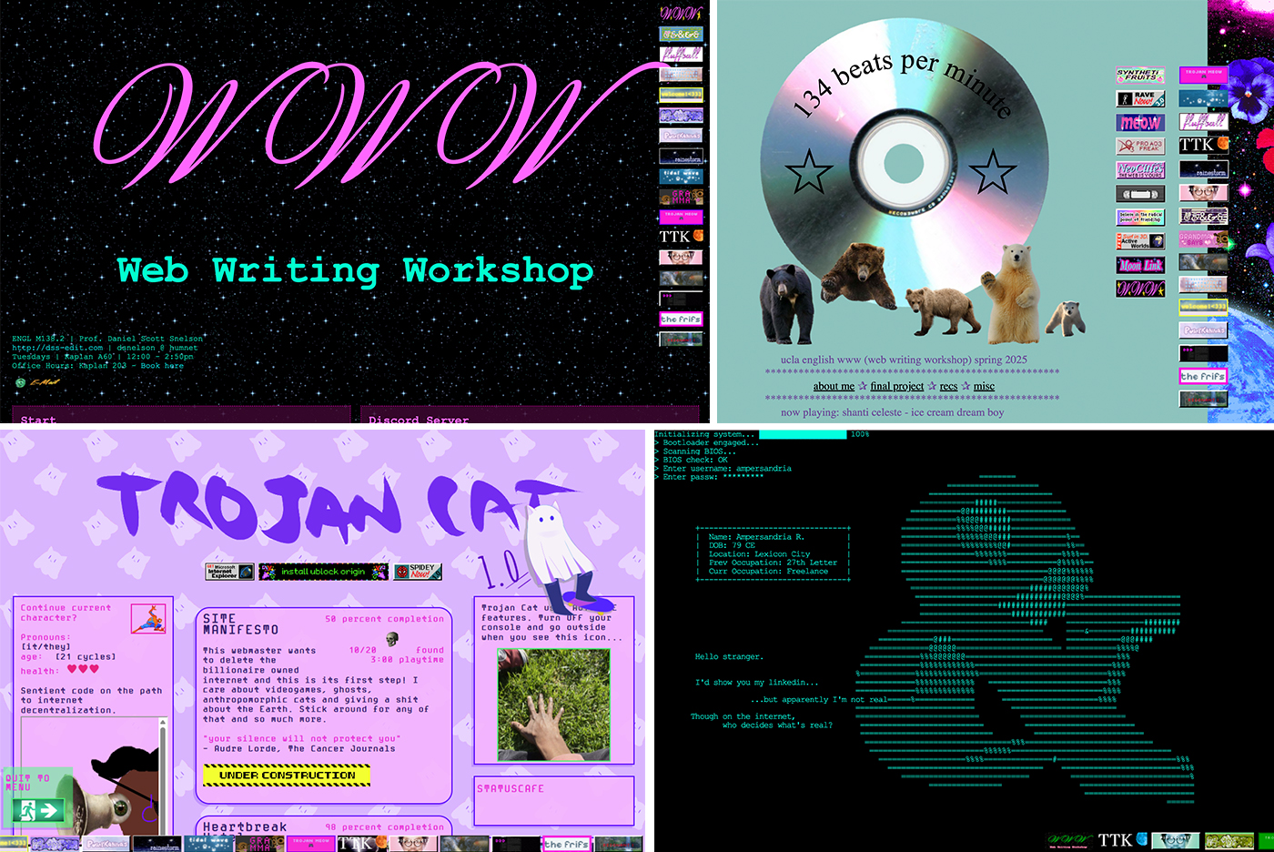 The course website from Snelson’s Web Writing Workshop (top left), with three sites created by students. The artwork may evoke the internet of the 1990s, but the sites speak to the present moment.