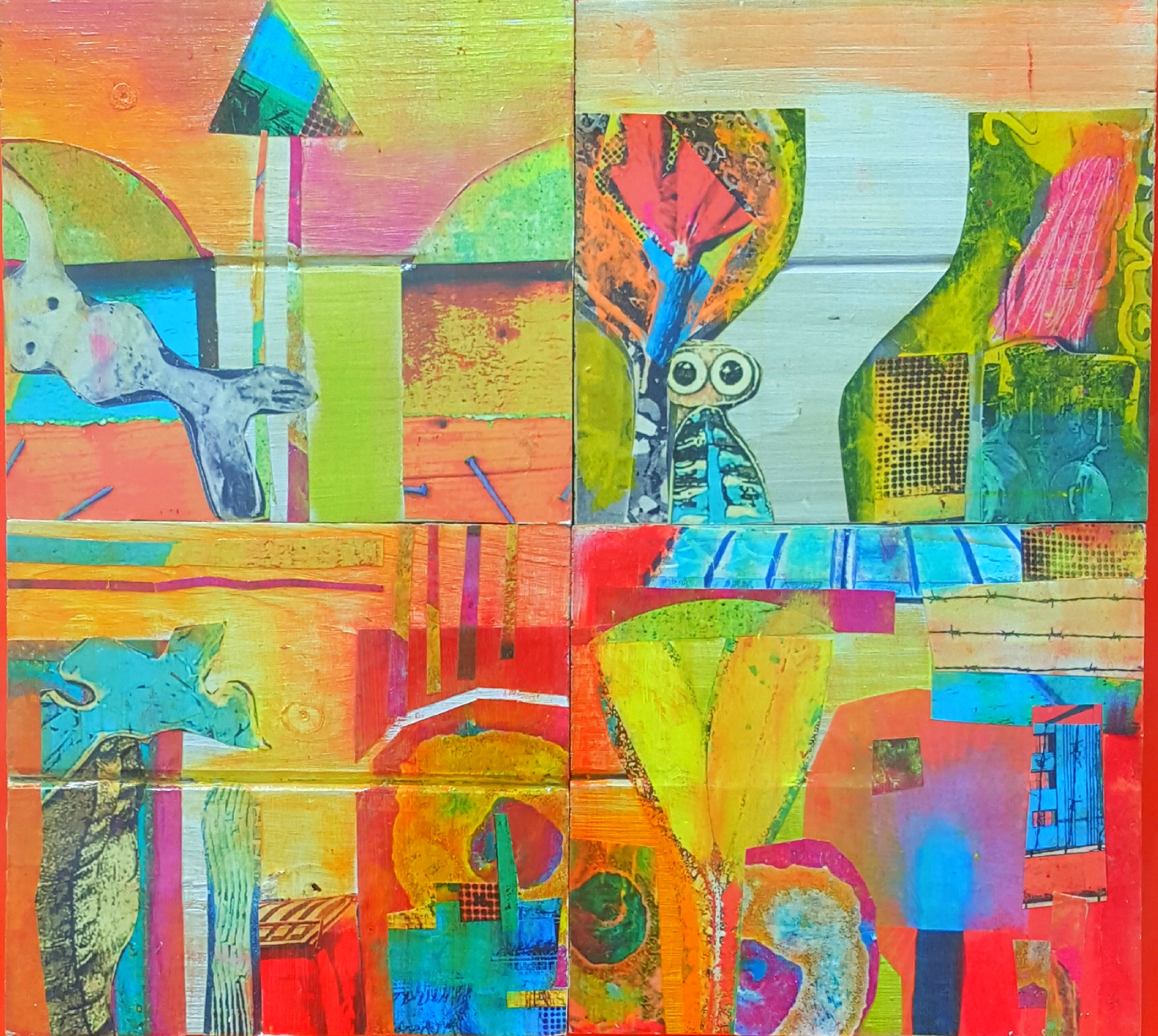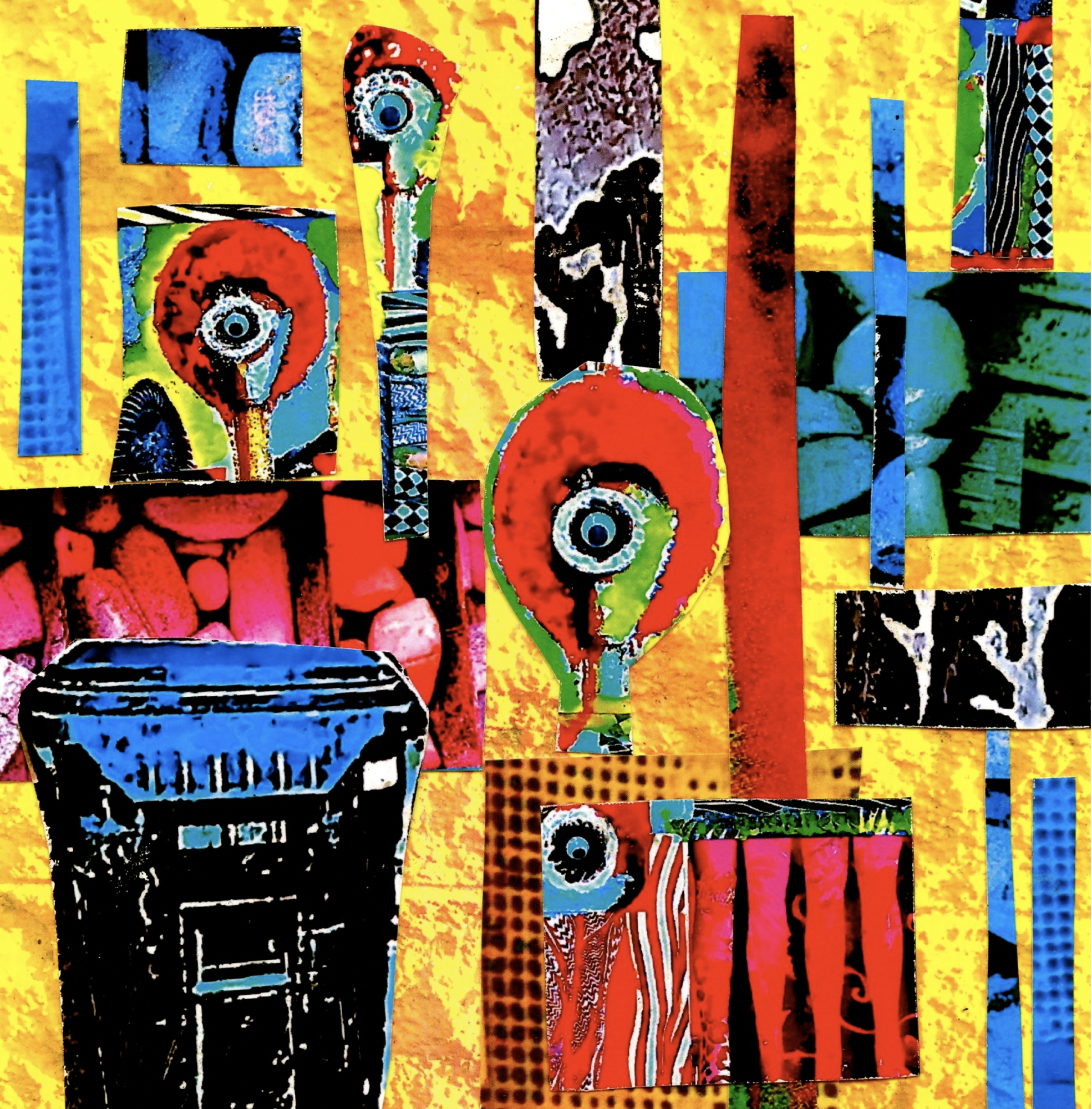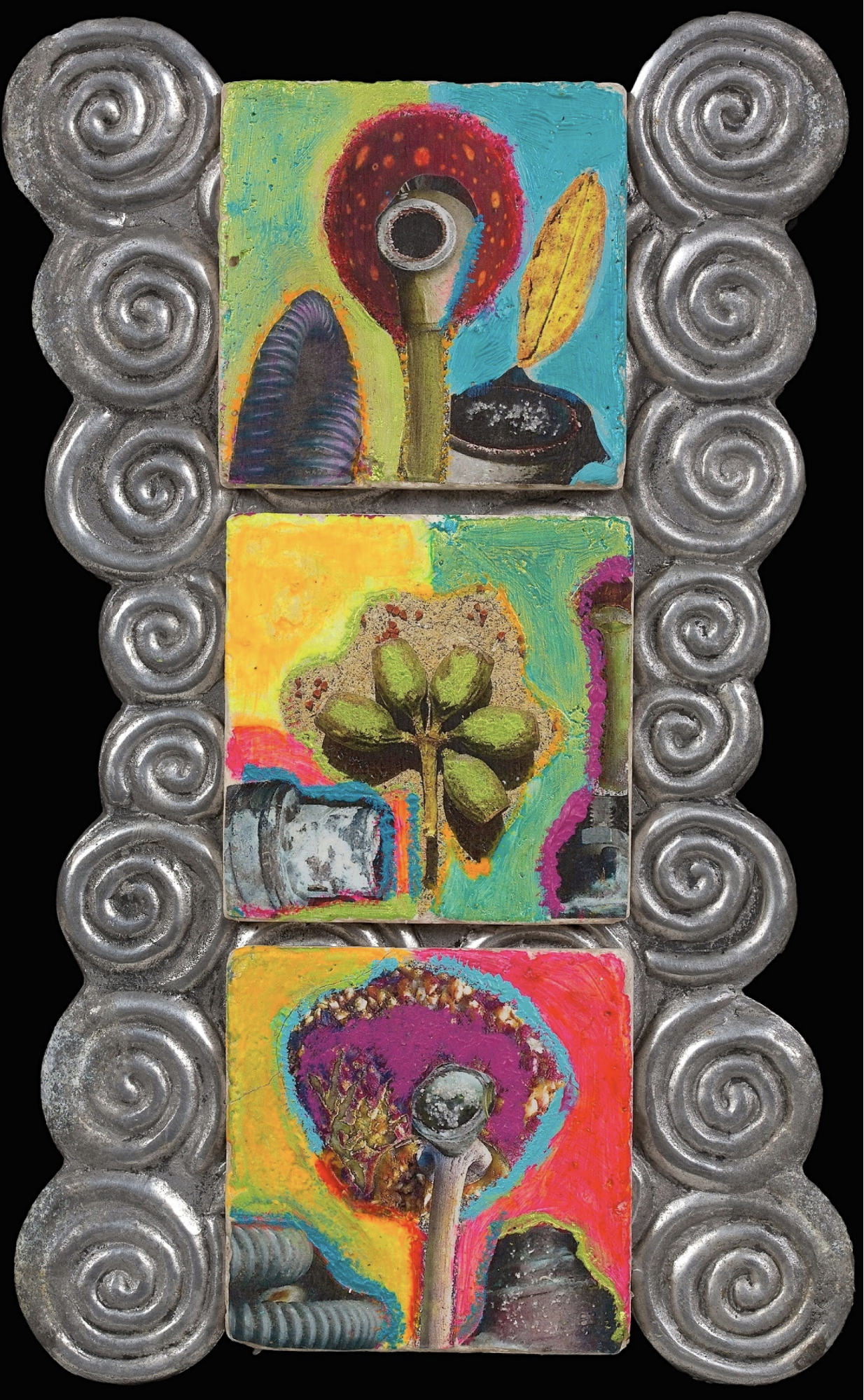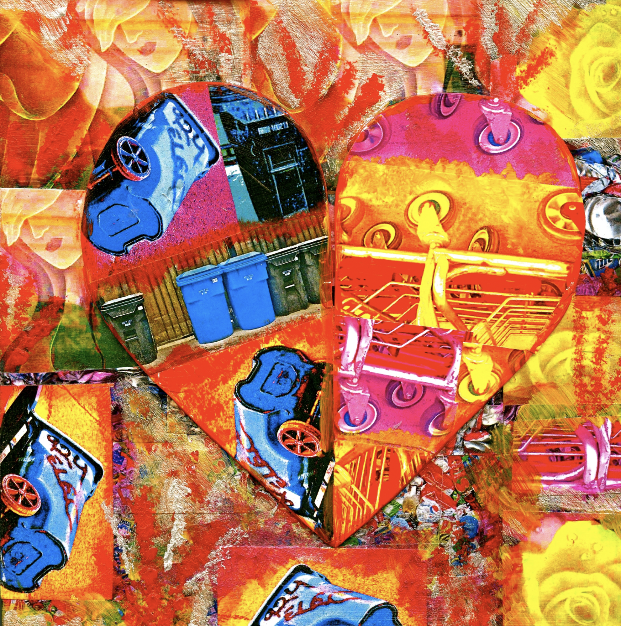 Zubiaurre takes pictures of urban trash and its containers and prints the pictures on a regular printer, cuts them into pieces, and uses these pieces to make her “trashcollages.” She adds color and texture with acrylic paint, and the bright colors of Mexican popular art have heavily influenced her work. From there, she takes pictures of her finished trashcollages, prints them out, and cuts them into pieces once again. She calls this process “endless recycling,” since one trashcollage is often reused and recycled to make more collages. The concept of “endless recycling” refers to the fact that the main source of frames for her art is from thrift stores. She “recycles” used frames, platters, coasters, and decorative boxes to frame her trash art.