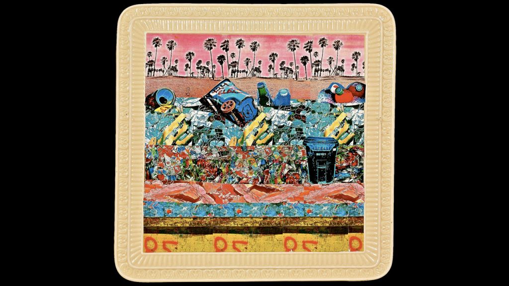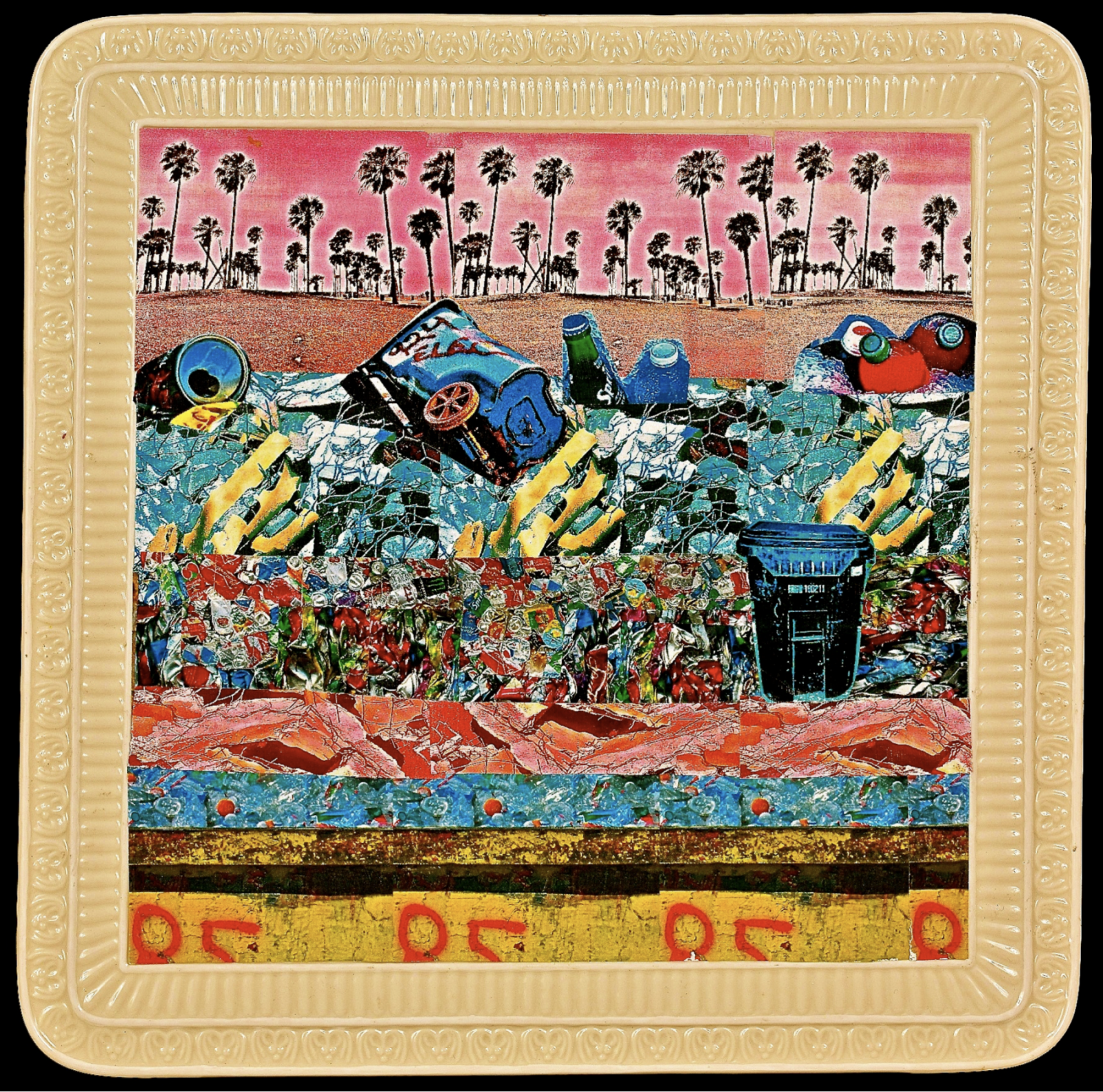 - Trashscape on a thrift store platter–Venice, CA–Blue Trash Can Series (Filomena Cruz)