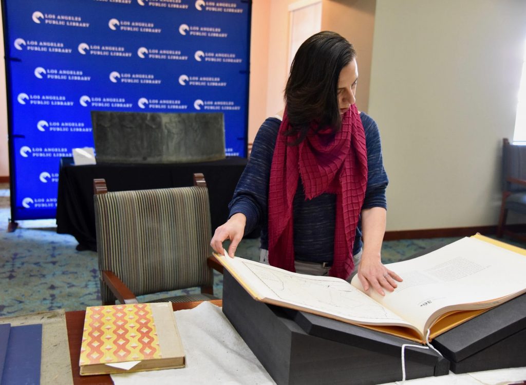 Professor Marissa López examines Robert Becker’s "Diseños of California Ranchos: Maps of thirty-seven Land Grants if 1822-1846 from the Records of the United States District Court, San Francisco" in the Rare Books room at Central Library downtown.